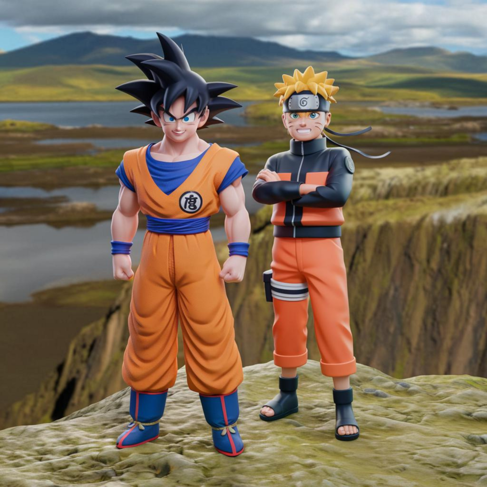 This stunning artwork captures an epic crossover moment between two of the most iconic anime heroes, Goku and Naruto, set against the backdrop of a majestic mountain. Perfect for fans of both Dragon Ball and Naruto, this piece brings together the worlds of Saiyans and Ninjas in an unforgettable scene. Ideal for anyone who loves anime, manga, and epic battles.